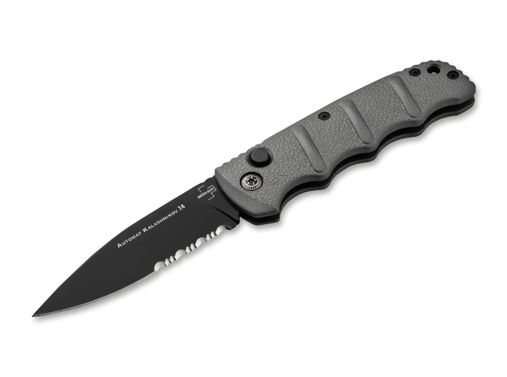 Böker Plus AKS-74 Black D2 zsebkés alumínum markolattal és Fekete D2 pengével. Teljes hossza 20 cm, penge hossza 8,5 cm, penge vastagsága 3 mm. A kés nettó súllya 119 gramm.