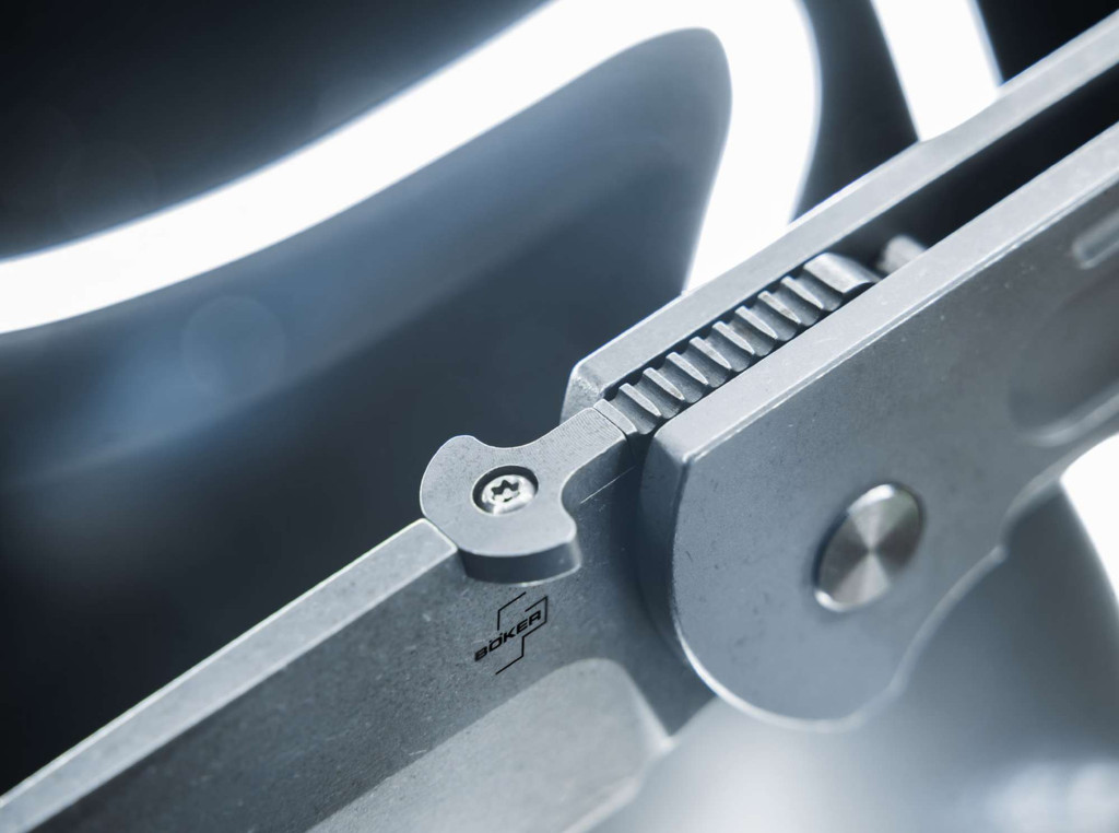 Böker Plus Evade zsebkés rozsdamentes acél markolattal és Szürke D2 pengével. Teljes hossza 21,1 cm, penge hossza 9 cm, penge vastagsága 3,3 mm. A kés nettó súllya 167 gramm.
