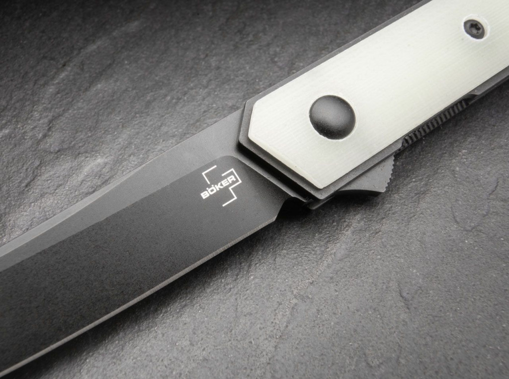 Böker Plus Kwaiken Air Mini G10 Jade zsebkés G10 markolattal és Fekete VG-10 pengével. Teljes hossza 18,3 cm, penge hossza 7,8 cm, penge vastagsága 2,6 mm. A kés nettó súllya 60 gramm.