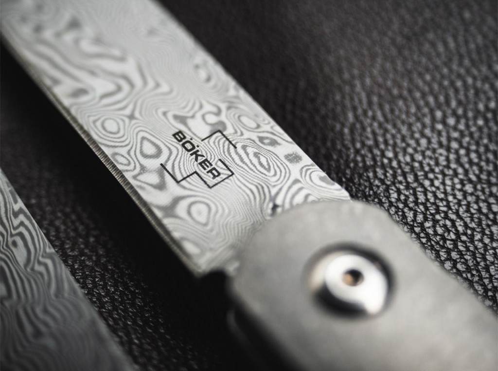 Böker Plus LRF Damascus zsebkés Titanium markolattal és Bevonat nélküli Damaszkuszi acél pengével. Teljes hossza 18 cm, penge hossza 8,6 cm, penge vastagsága 2 mm. A kés nettó súllya 55 gramm.