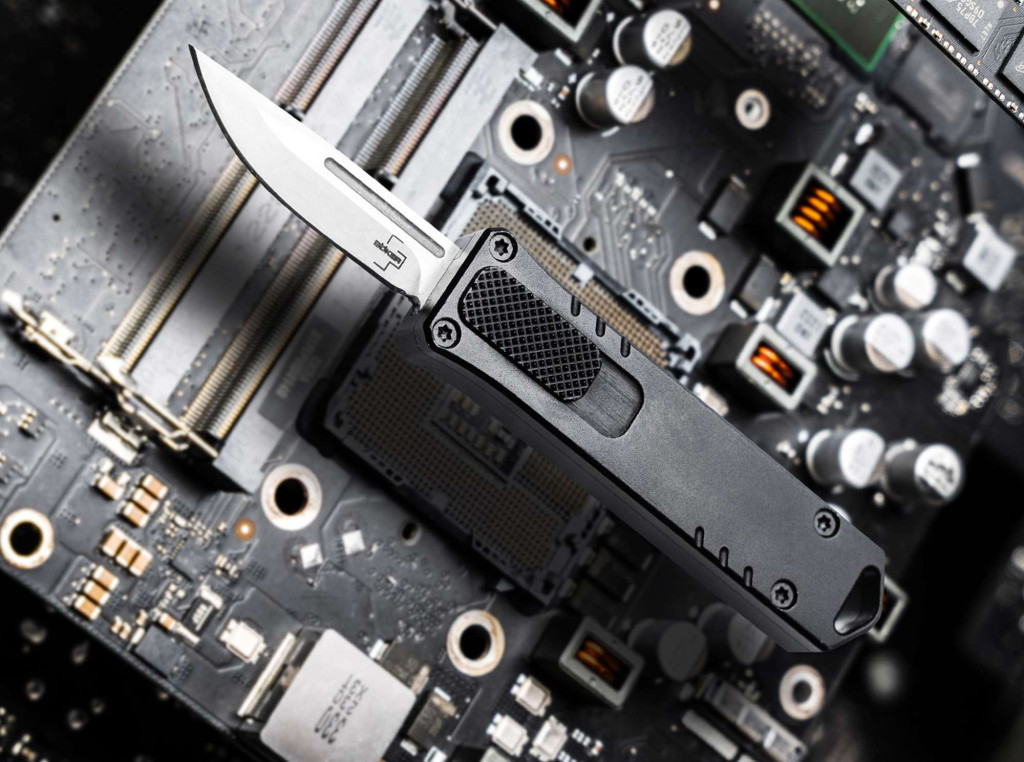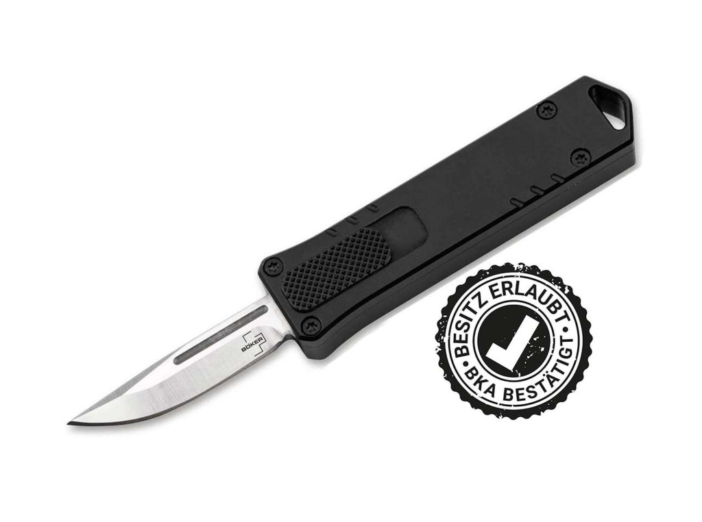 Böker Plus Micro USB OTF zsebkés alumínum markolattal és Bevonat nélküli D2 pengével. Teljes hossza 10,9 cm, penge hossza 4 cm, penge vastagsága mm. A kés nettó súllya 33 gramm.