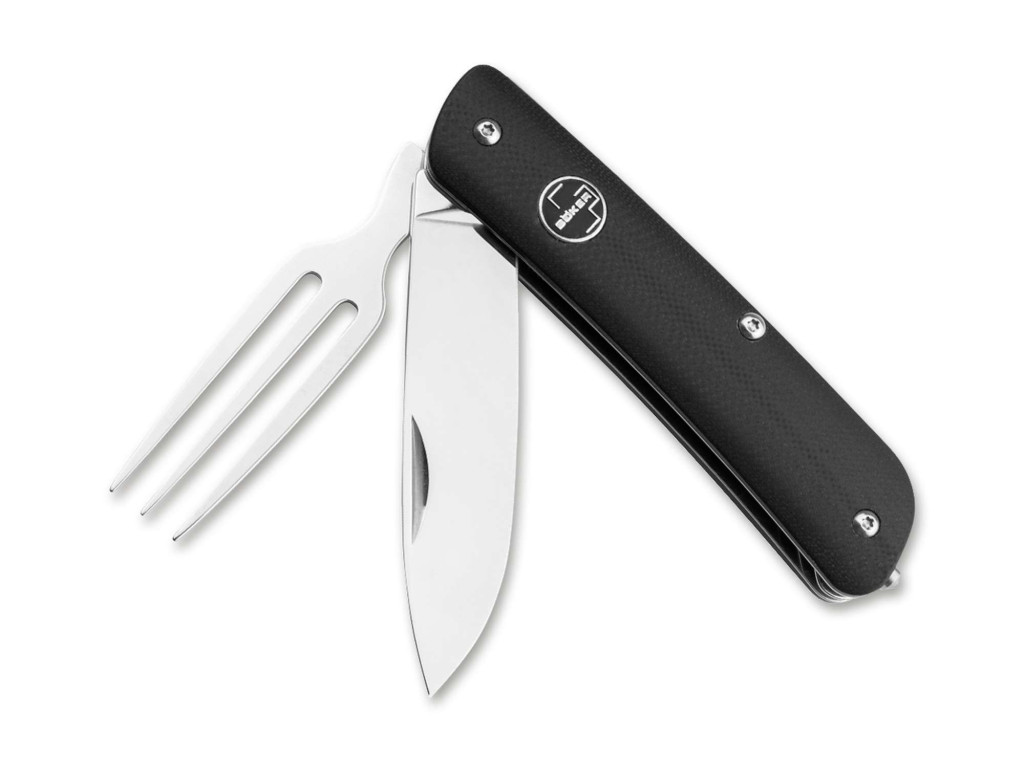 Böker Plus Tech Tool Fork zsebkés G10 markolattal és Bevonat nélküli 12C27 pengével. Teljes hossza 16,8 cm, penge hossza 7,1 cm, penge vastagsága 2,4 mm. A kés nettó súllya 82 gramm.