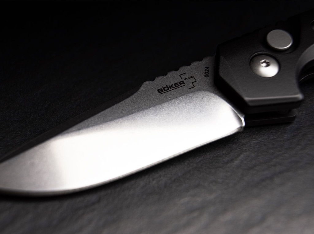 Böker Plus Thunder Storm Auto zsebkés alumínum markolattal és Bevonat nélküli AUS-8 pengével. Teljes hossza 18,5 cm, penge hossza 7,2 cm, penge vastagsága 3 mm. A kés nettó súllya 102 gramm.