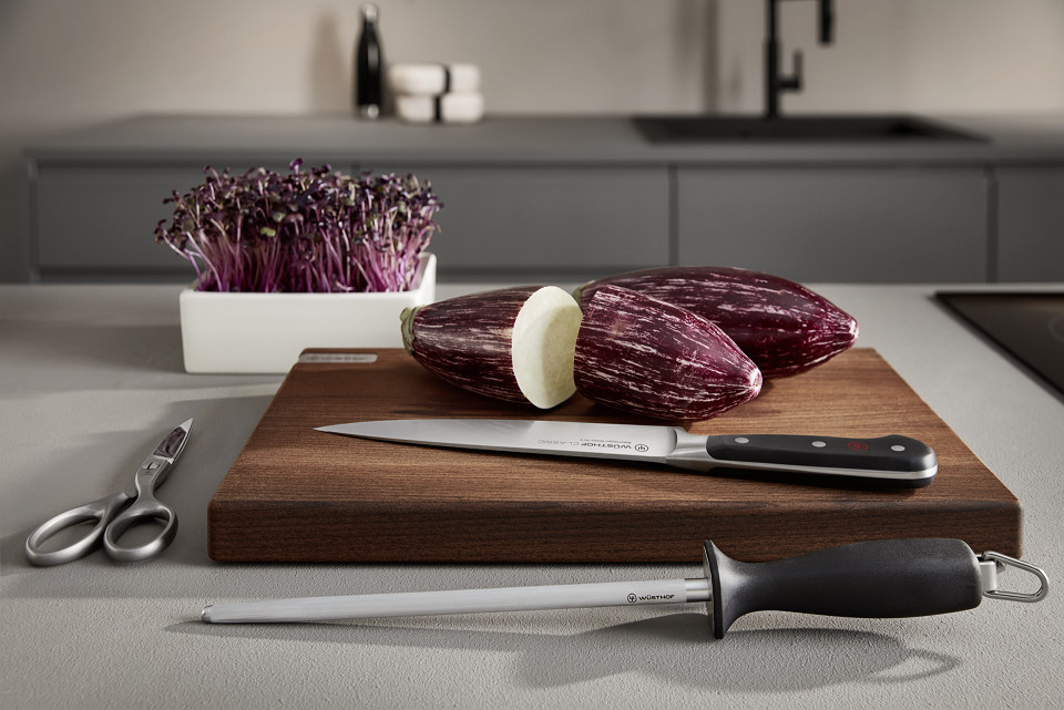 A Wüsthof 7296 vágódeszka (XL) prémium minőségű hőkezelt bükkfából készült, amely rendkívül tartós, ellenáll a nedvességnek és a deformációnak. A nagy felület ideális húsok, zöldségek és kenyér szeleteléséhez, miközben védi a kések élét. Stílusos, természetes megjelenésű konyhai alapdarab.