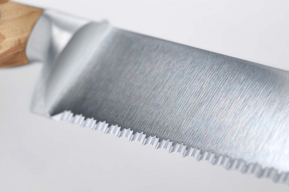 A Wüsthof Amici kenyérvágó kés 23 cm a kézműves minőség és a funkcionalitás tökéletes példája. Pengéje Solingenben, a „kések városában” készül, egy darabból kovácsolt, rozsdamentes króm-molibdén-vanádium acélból, amely rendkívüli éltartásáról és tartósságáról ismert. A duplafogazott penge különlegessége, hogy nem tépi, hanem tisztán és könnyedén vágja a kemény héjú és puha belsejű pékárukat, tortákat és süteményeket is.
