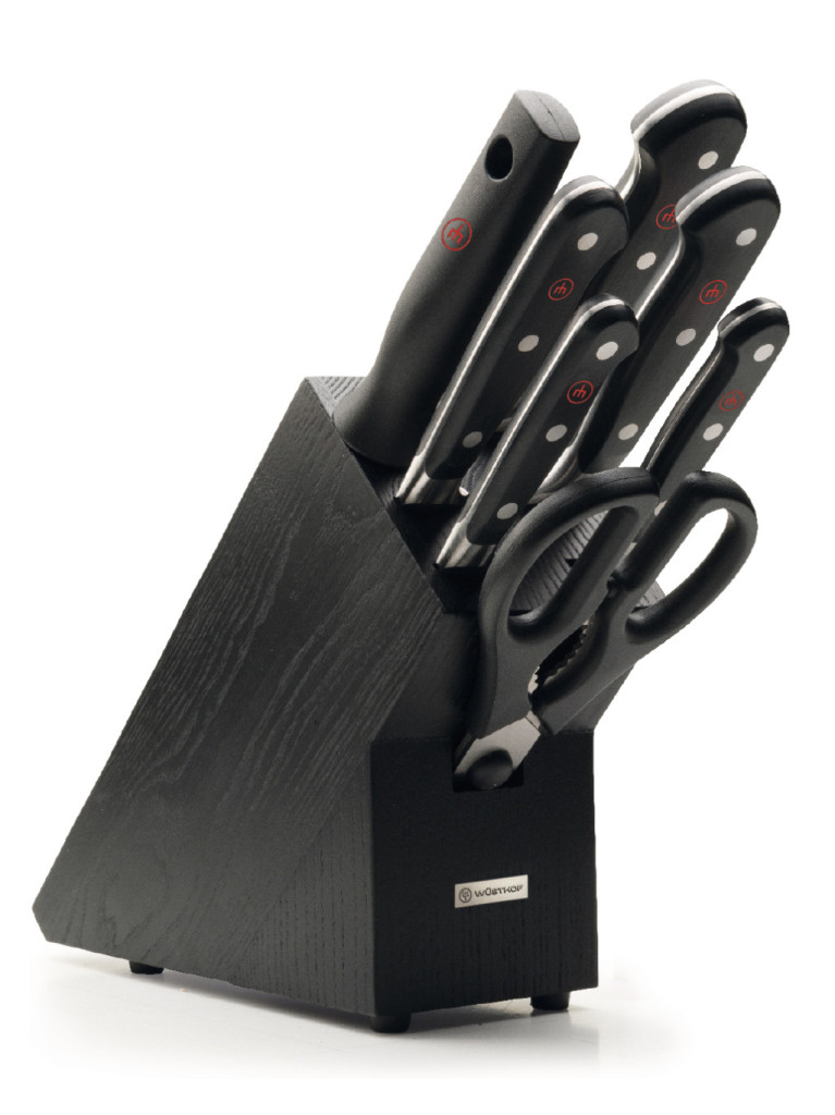 A Classic sorozat ergonomikus, hármas szegecselésű markolata biztonságos és kényelmes fogást biztosít, míg a tökéletes súlyelosztás precíz irányíthatóságot nyújt. A szett minden fontos konyhai feladatra tartalmaz egy professzionális eszközt: séf-, hámozó-, kenyérvágó-, szeletelő- és filézőkést, továbbá húsvillát és egy elegáns kőrisfa tárolóblokkot.